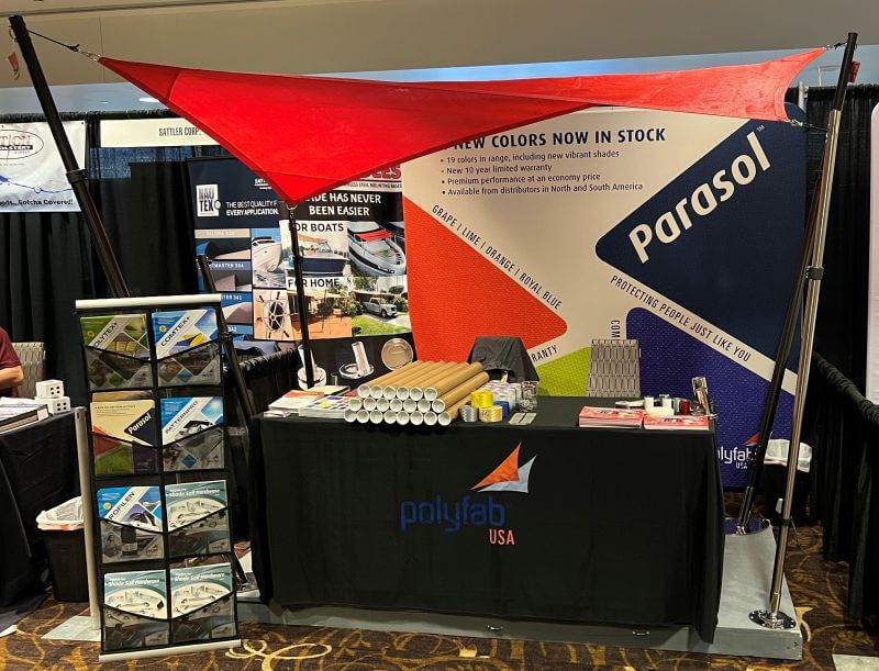Polyfab USA will be exhibiting at the 2023 Marine Fabricator’s Association (MFA) Conference in New Orleans, January 26-28. Here is a shot of a display from last year’s Conference. We combined with CARBIEPOLES to construct a shade fly exhibit–using Parasol Commercial Grade Shadecloth–on a T-Top, that was shown at the Keyston Bros booth.