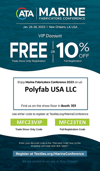 Did you know that Polyfab USA also sells products to the marine cover industry? We are members of the Marine Fabricators Association (MFA) and will be exhibiting at the upcoming Marine Fabricators Conference in New Orleans, January 26-28 at the Sheraton New Orleans. Please see below for your VIP Discount, courtesy of Polyfab USA!